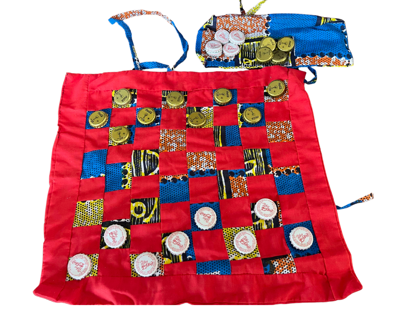This eco-friendly chess set features a soft cloth board and uniquely crafted pieces made from recycled bottle caps. Made in Kenya, it rolls up with a built-in bag—perfect for play on the go. Fun, portable, and full of sustainable charm!